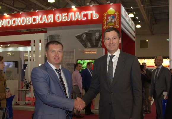 На снимке: крепкое рукопожатие у экспозиции ОЭЗ «Дубна» - зампред правительства Московской области – министр инвестиций и инноваций Денис Буцаев (справа) и заместитель генерального директора ООО «Эйлитон» Вадим Терехов.